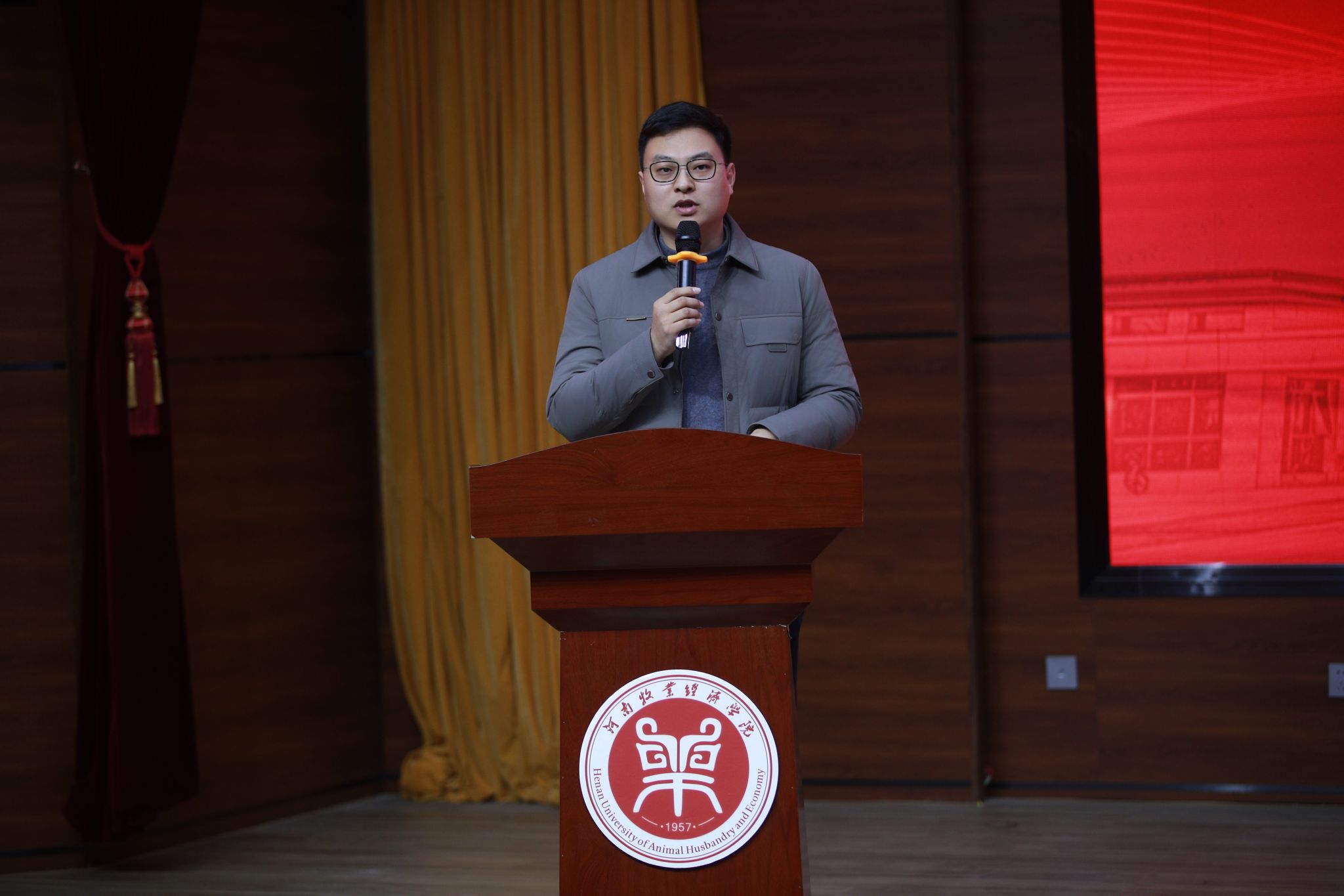 12月18日下午,我校第七届辅导员素质能力大赛决赛在龙子湖校区一号教学楼合100报告厅成功举办。校党委副书记姚毅、副校长边传周出席并观看比赛;河南工业大学党委学工部部长王迪,华北水利水电大学党委学工部部长郭瑾莉,河南警察学院党委学工部部长张文辉,河南省高校青年理论宣讲名师工作室主持人、郑州航院党委学工部学生社区管理科科长何迎亚,以及我校党委学工部部长郝景昊、大学生心理健康教育中心主任张颖、马克思主义学院副院长郭霞担任评委;党委组织部、党委宣传部、学生工作相关职能部门负责人,以及各学院党委书记、副书记、团委书记(学工办主任)、团委副书记(学工办副主任)、全体辅导员和学生代表观看了比赛。