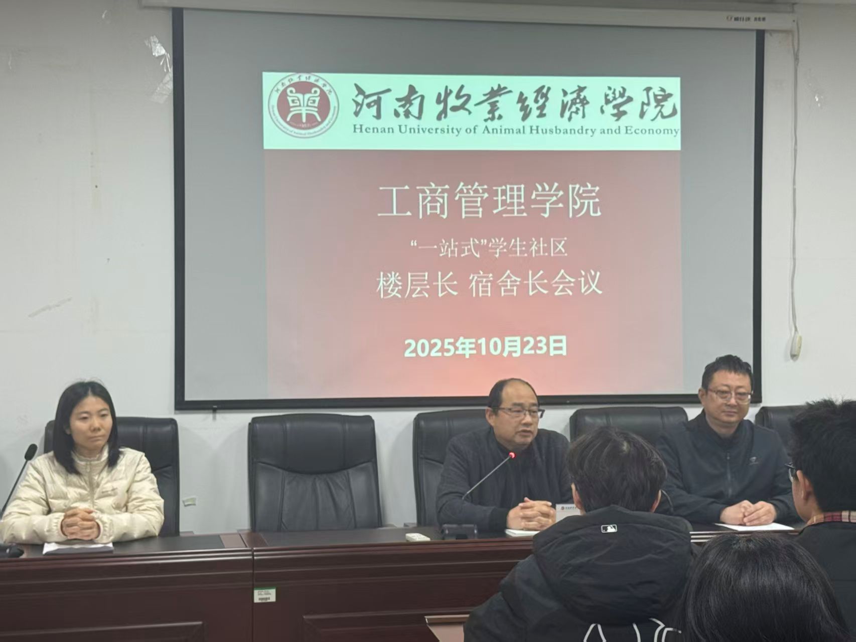 为进一步加强学生楼层长队伍建设,提升我院“一站式”学生社区的教育、管理和服务水平,深化新学期学生安全与美好社区建设,提升大学生文明养成主题教育效果,工商管理学院于2025年10月23日召开“一站式”学生社区楼层长、寝室长安全工作会议。院党委书记王国辉、党委副书记詹珅以及学院全体楼层长、宿舍长参加会议,会议由团委副书记周玉洁主持。